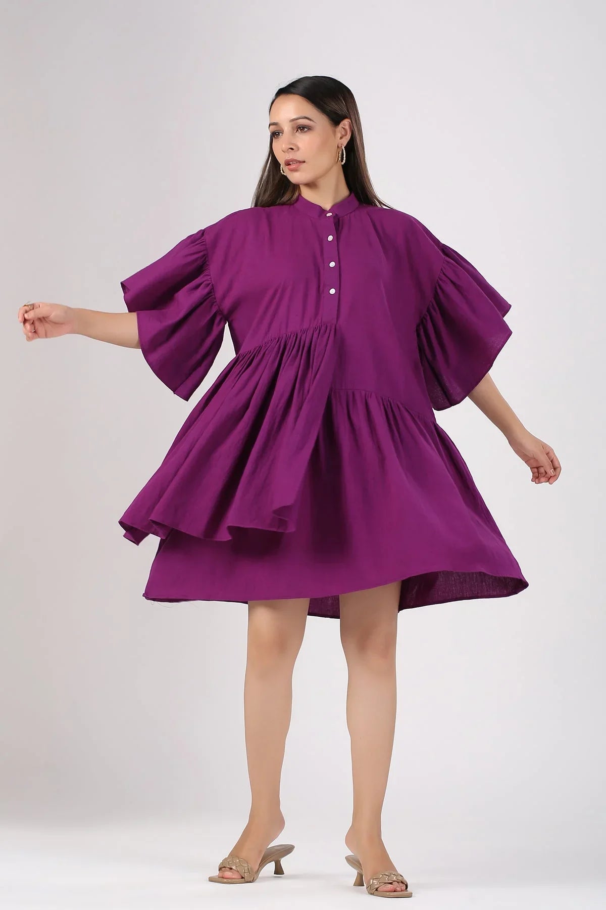 The roomy sleeves and tiered design add a playful touch, making this trendy purple mini dress not just stylish but also highly comfortable. Enjoy the freedom of movement and confidence that comes with wearing such a unique piece.