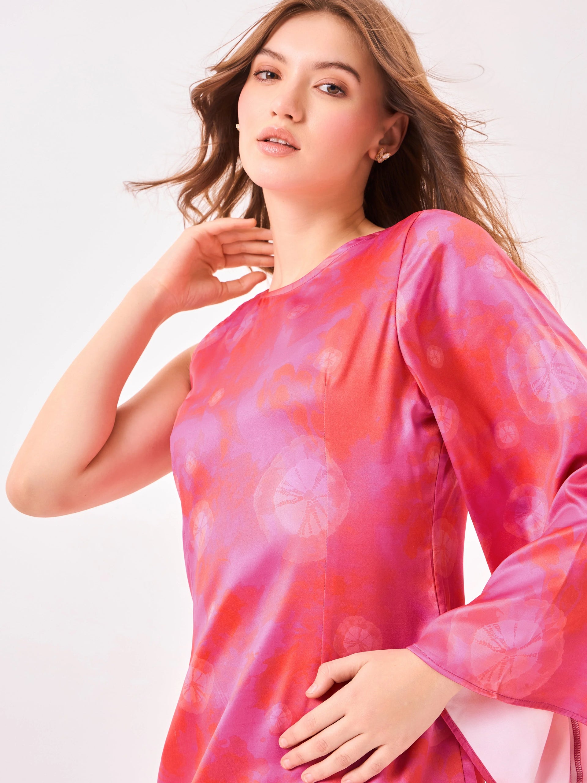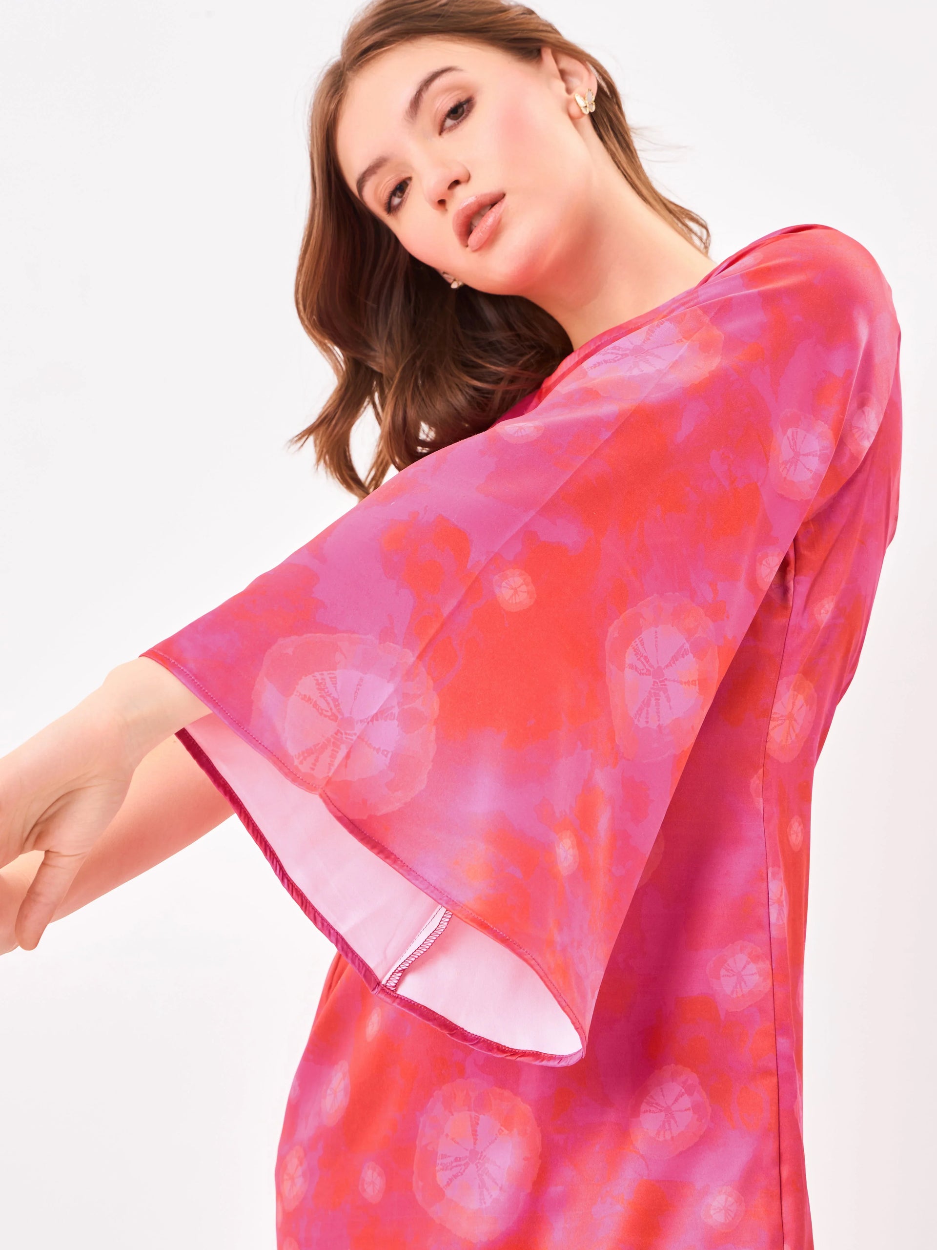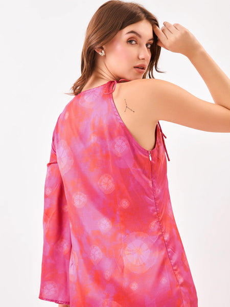 Colour: Pink Material: SatinOccasion: Party wear, evening events, date nights, celebrations Neckline: AsymmetricPattern: PrintedFit: Regular FitSleeve Type: Flared Sleeve Length: Mini lengthCare Instructions: Machine wash cold; tumble dry low; avoid high-heat ironing; wash similar colours together Pack Contains: 1 dress Country Of Origin: India
