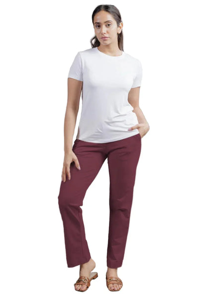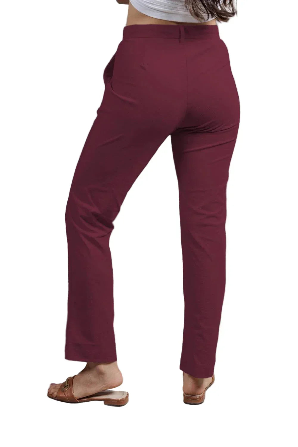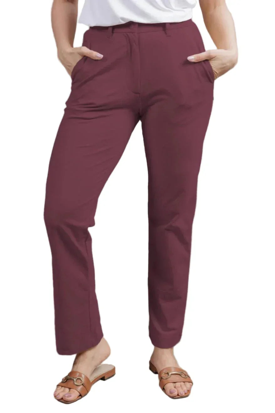 Colour: Red (Sangria)Material: SORONA® FabricOccasion: Workwear, Casual, Travel, Everyday WearPattern: SolidFit: Straight FitNo. of Pockets: 3 (Side pockets + 1 concealed zipper pocket)Rise Style: Mid RiseCare Instructions: Machine wash cold; do not bleach; tumble dry lowPack Contains: 1 Pair of PantsLength: Full LengthCountry Of Origin: India