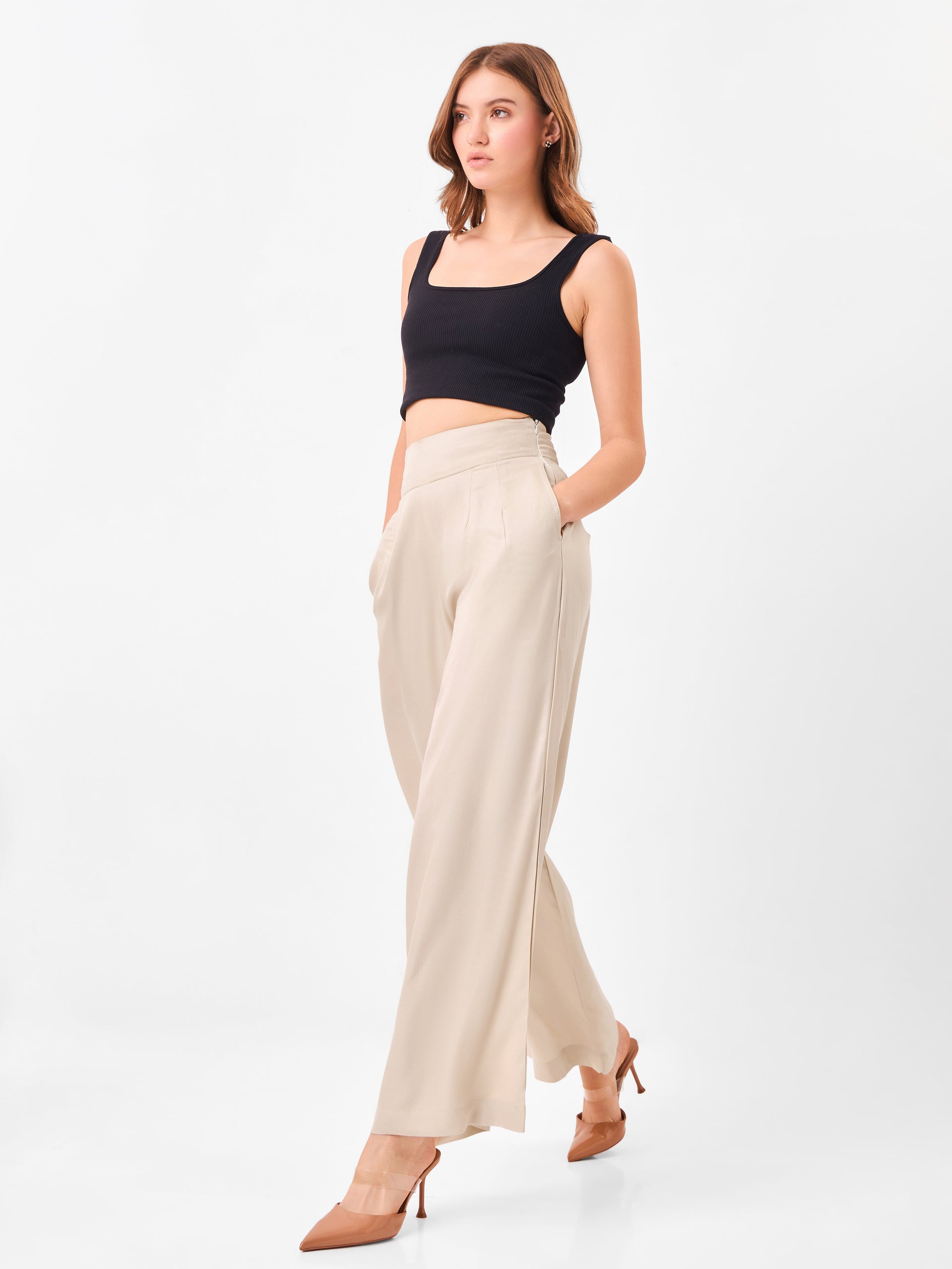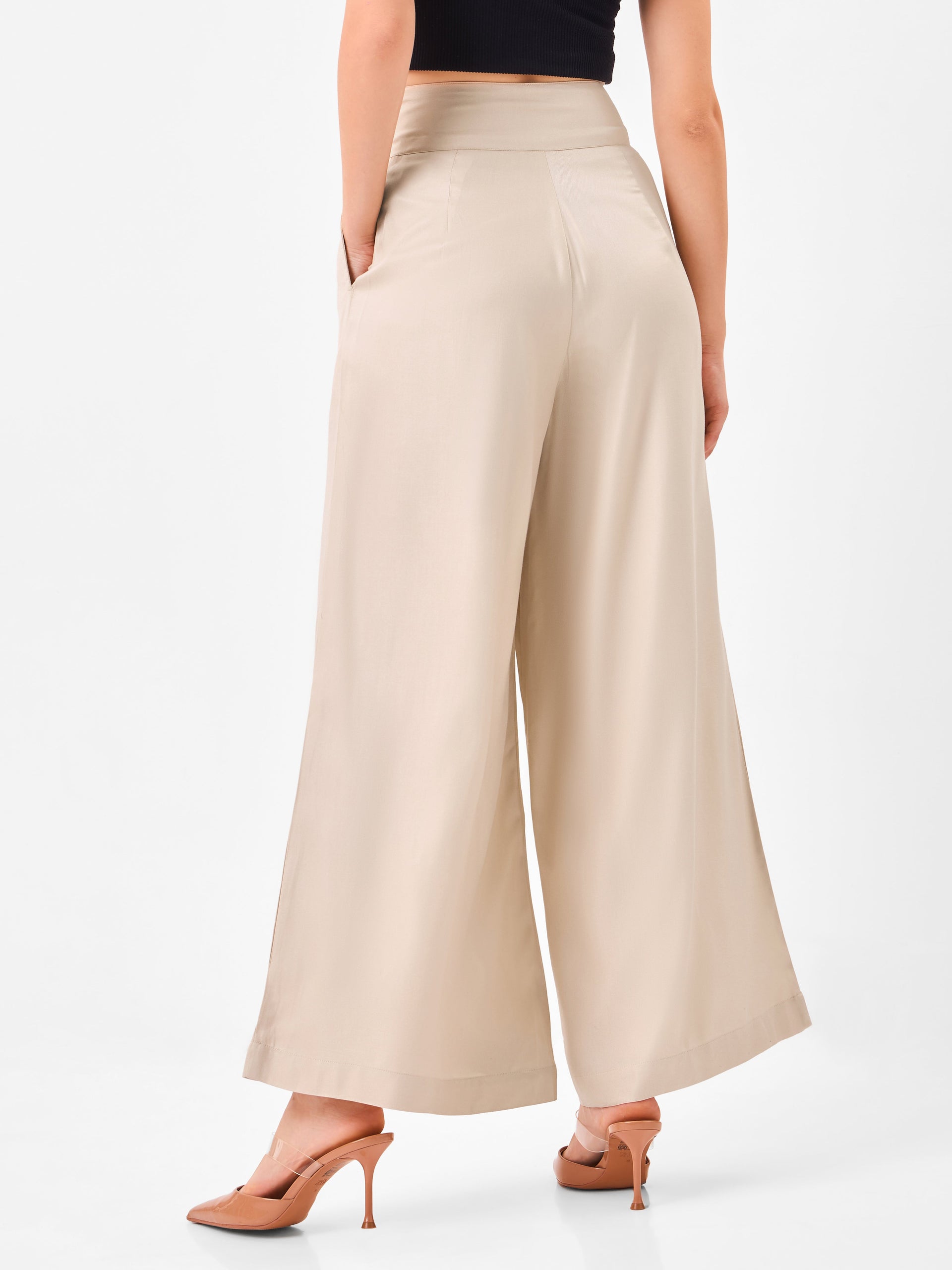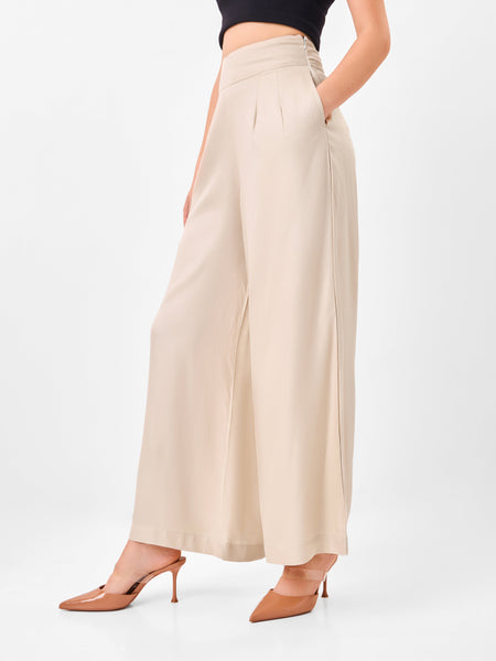 This pant features a chic and contemporary wide-leg silhouette in a light beige shade, designed for both comfort and flair. Made from a flowy, lightweight fabric, it boasts a high-rise waist with subtle pleat detailing and side pockets for practicality. The side seams feature discreet slits, adding an elegant touch and allowing for effortless movement. Perfectly paired with heels or flats, these pants offer a sophisticated look for daytime outings or evening events.