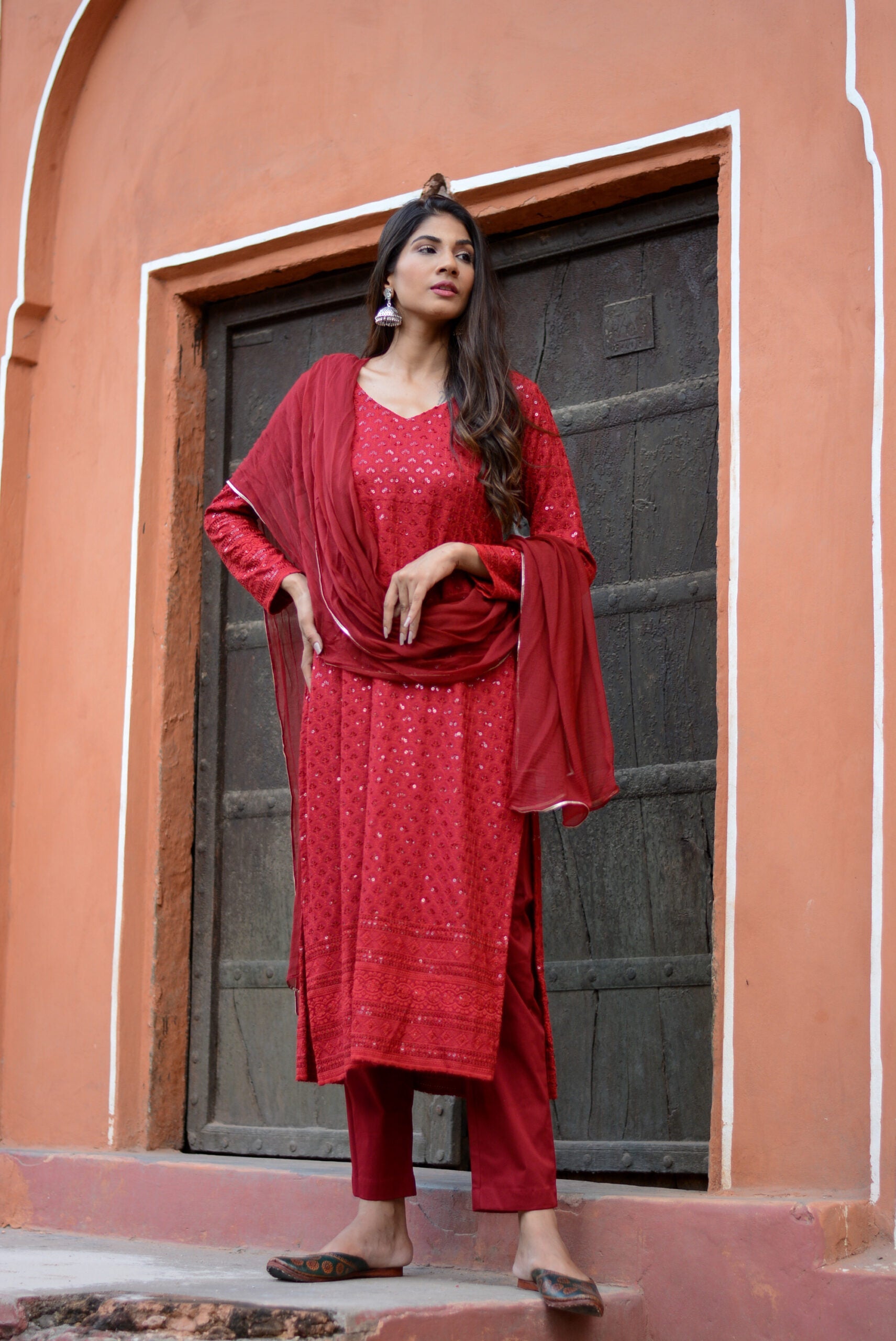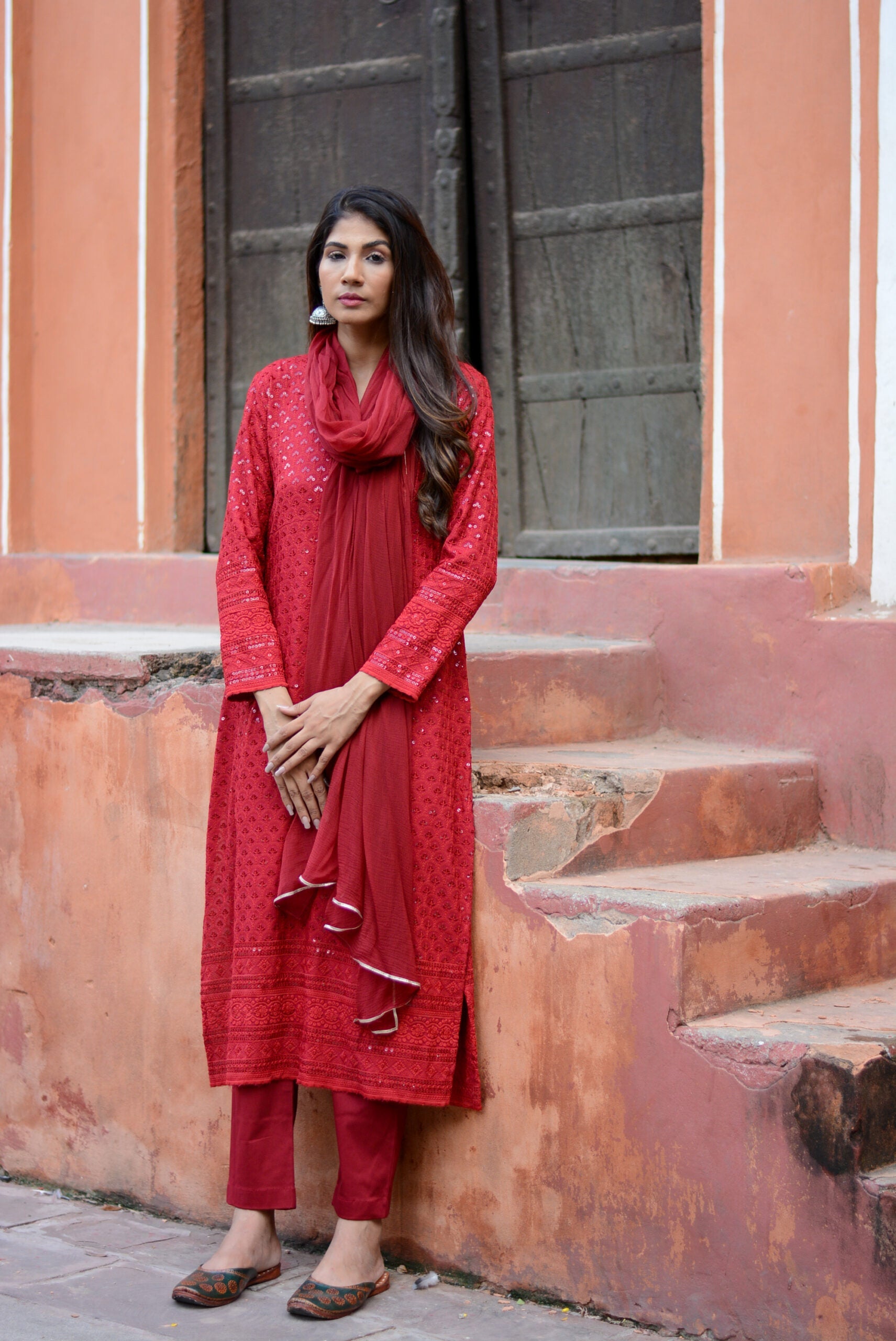 Caring for the carmine red chikankari suit set is easy. Gentle washing keeps the color bright. The set resists fading so it looks new after every wear. The bold color lets you stand out at family gatherings or cultural events. Layer with accessories from the Stylera store for a complete outfit.
