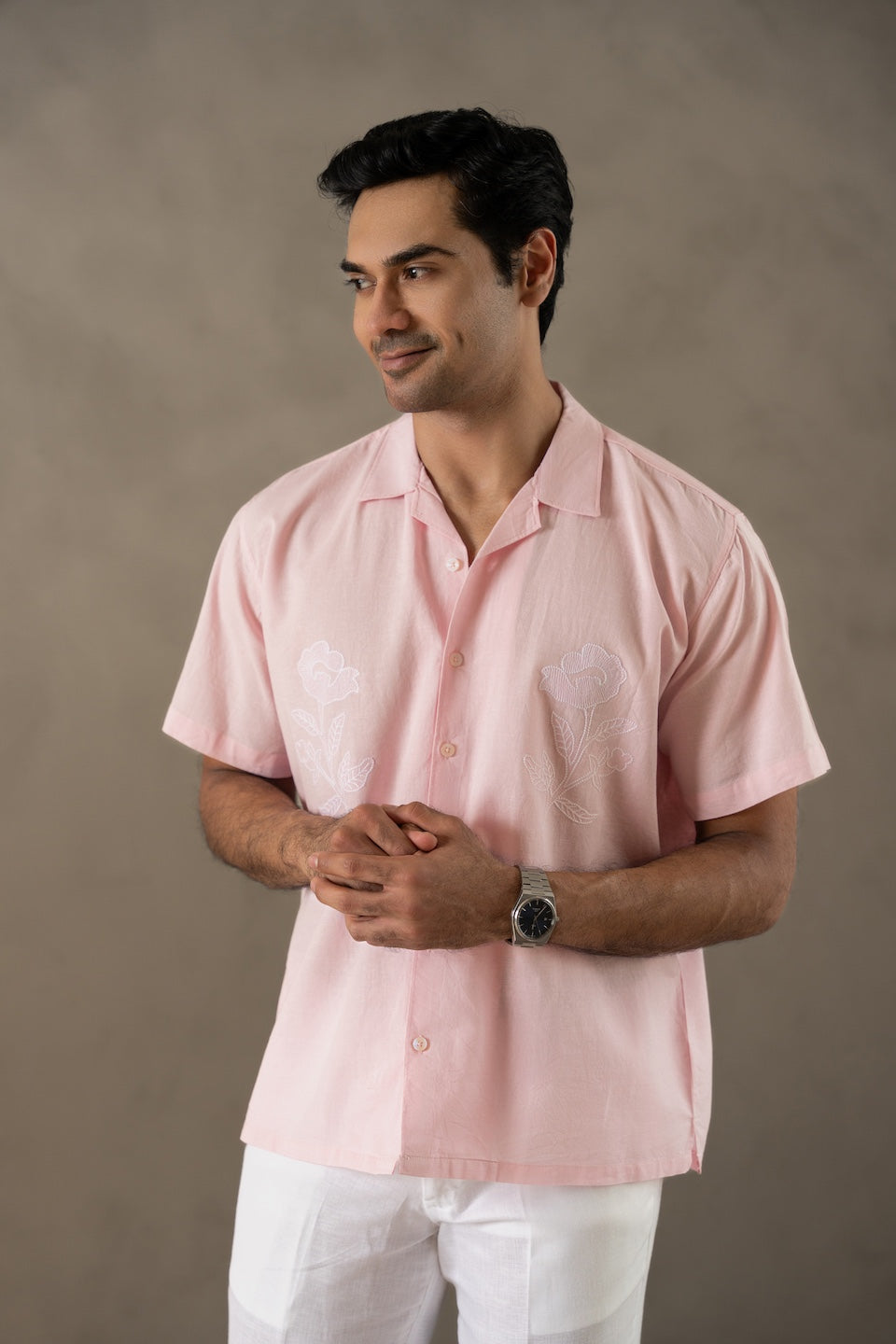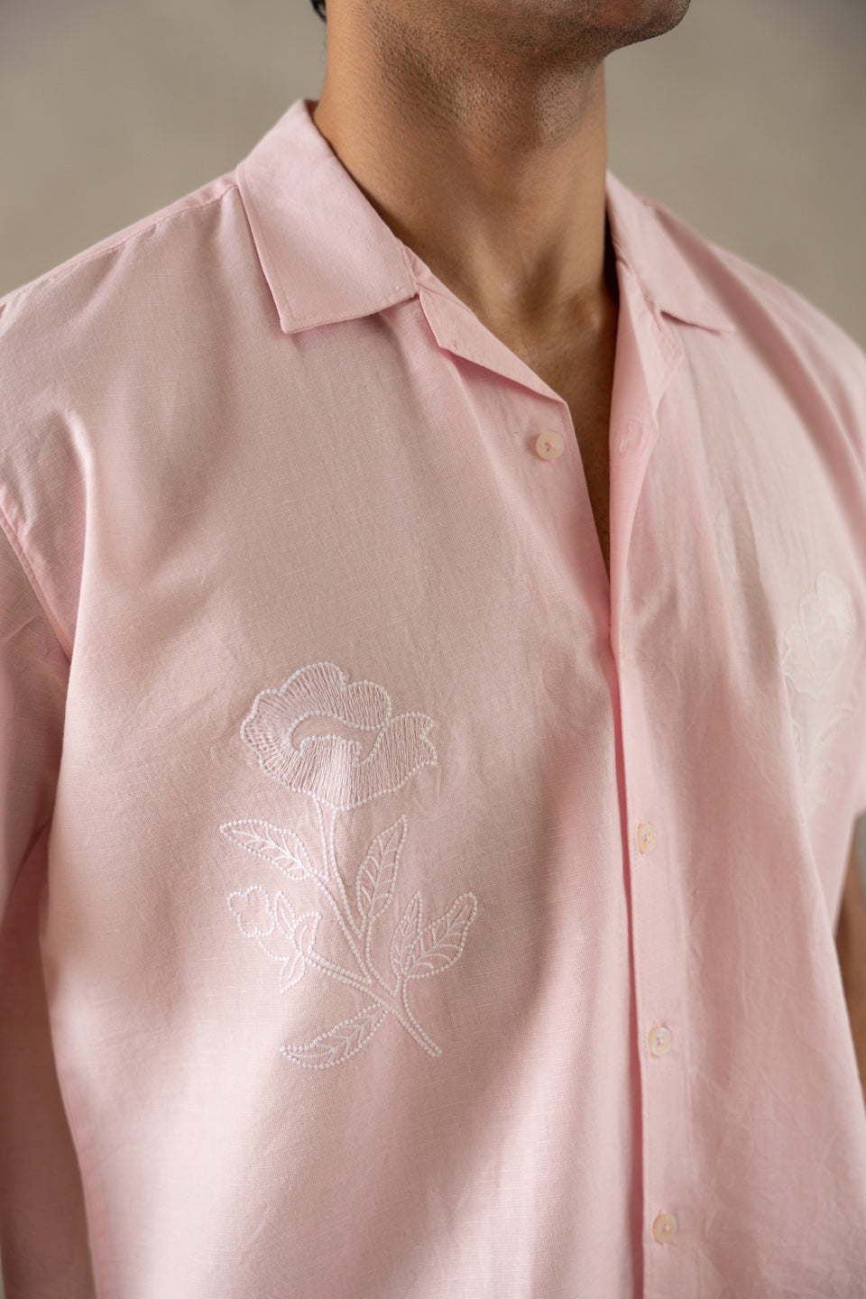 Botanic Bloom Box-Fit Embroidered Linen Shirt in Pearl Pink