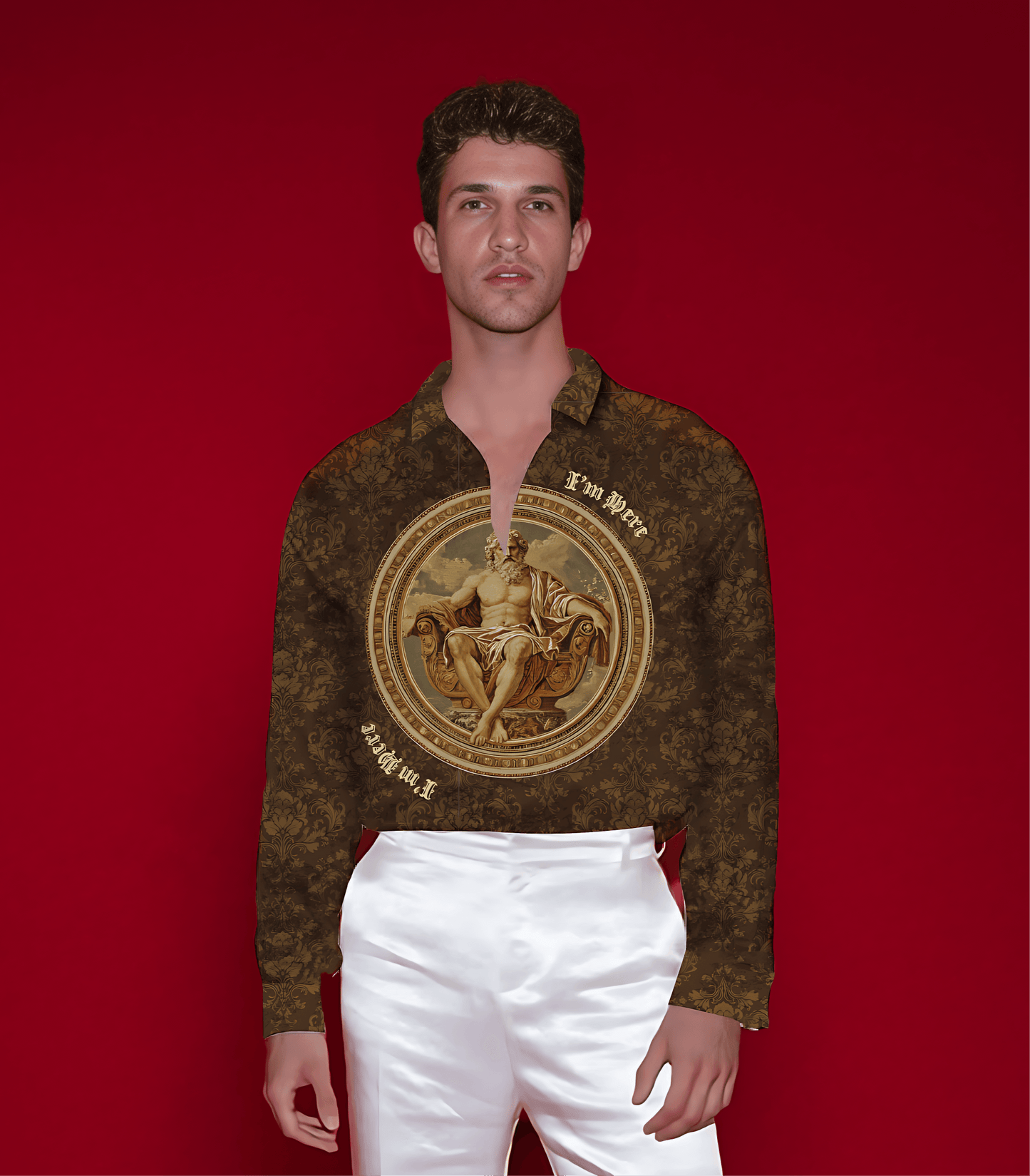 Elevate your wardrobe with the King of Heaven Full-Sleeve Shirt. This piece redefines sophistication for modern men. The luxury fashion shirt for men stands out with its intricate print, inspired by classic art and regal undertones. The rich brown tones pair easily with pants or jeans.