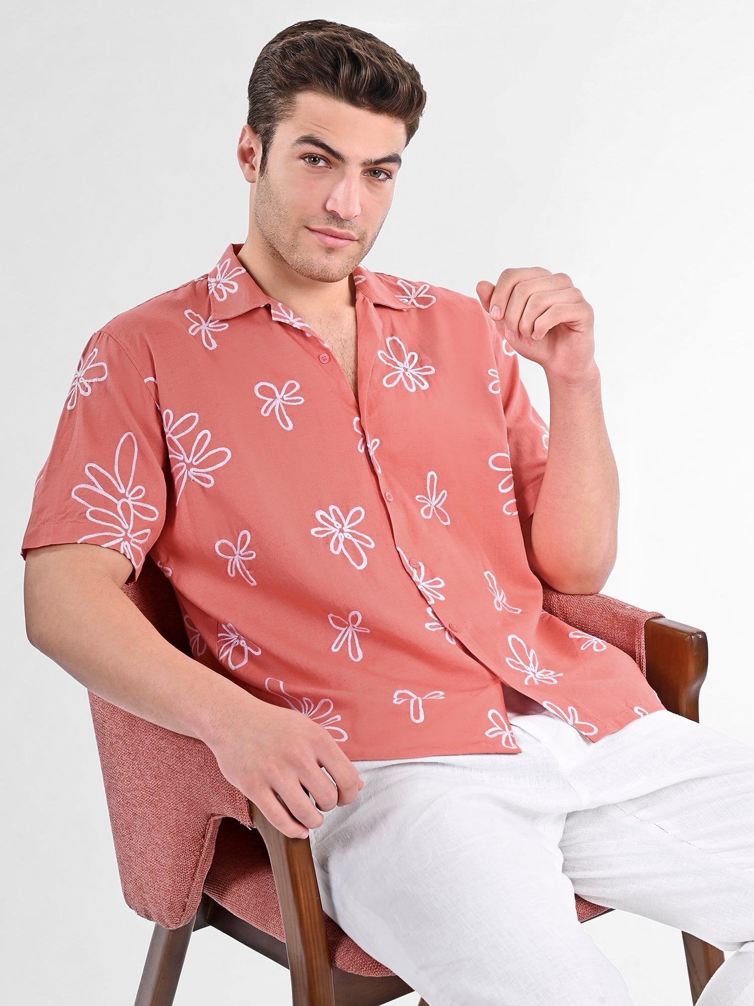 Box-Fit Floral Bloom Linen Shirt in Coral