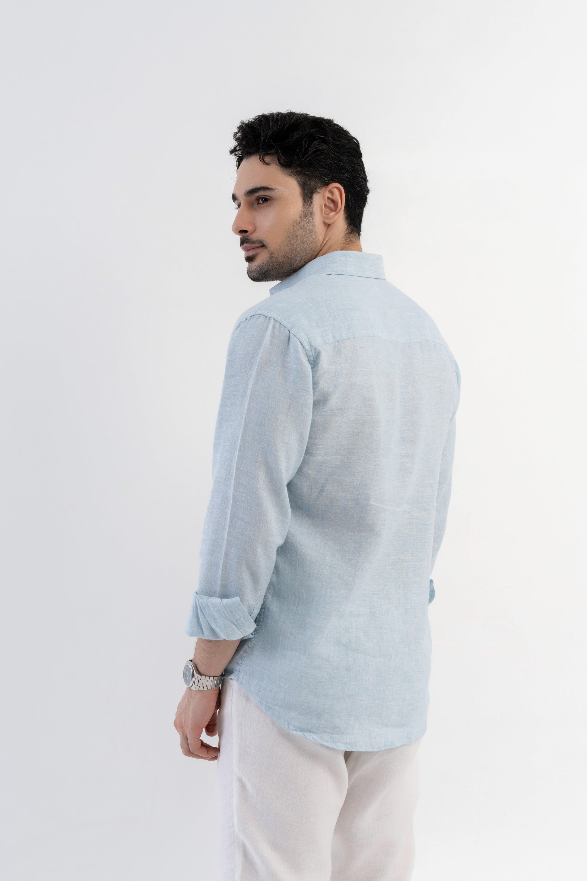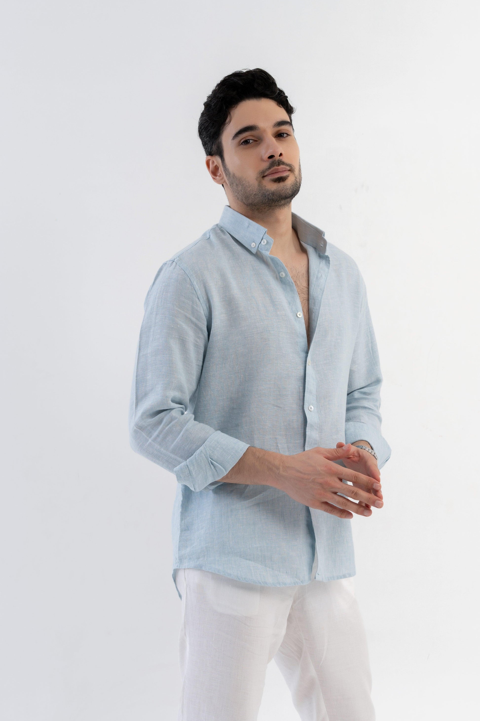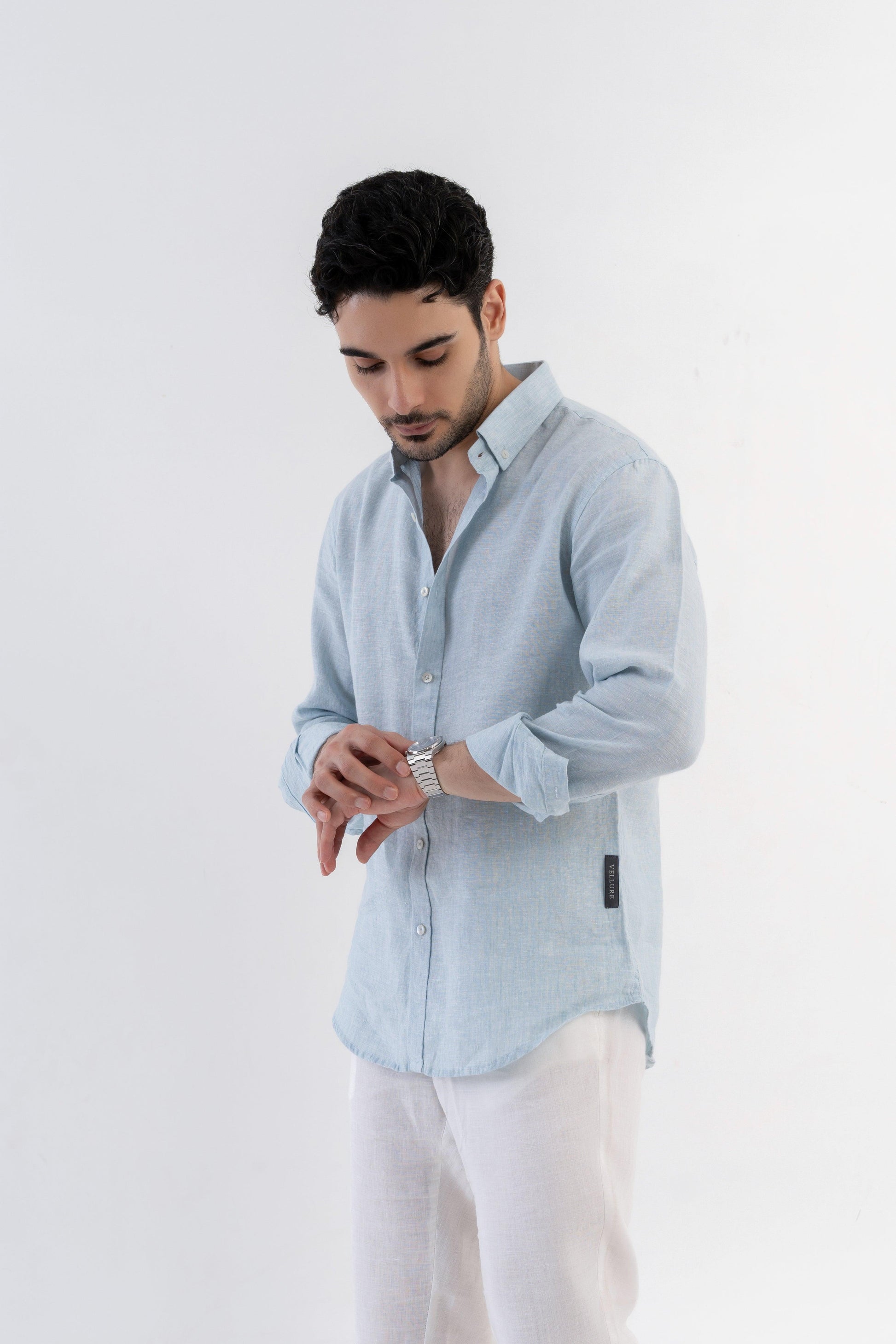 The long-sleeve soft frosty blue shirt is designed from a lightweight, breathable linen fabric, enzyme washed for extra softness — perfect for any semi-formal occasion.