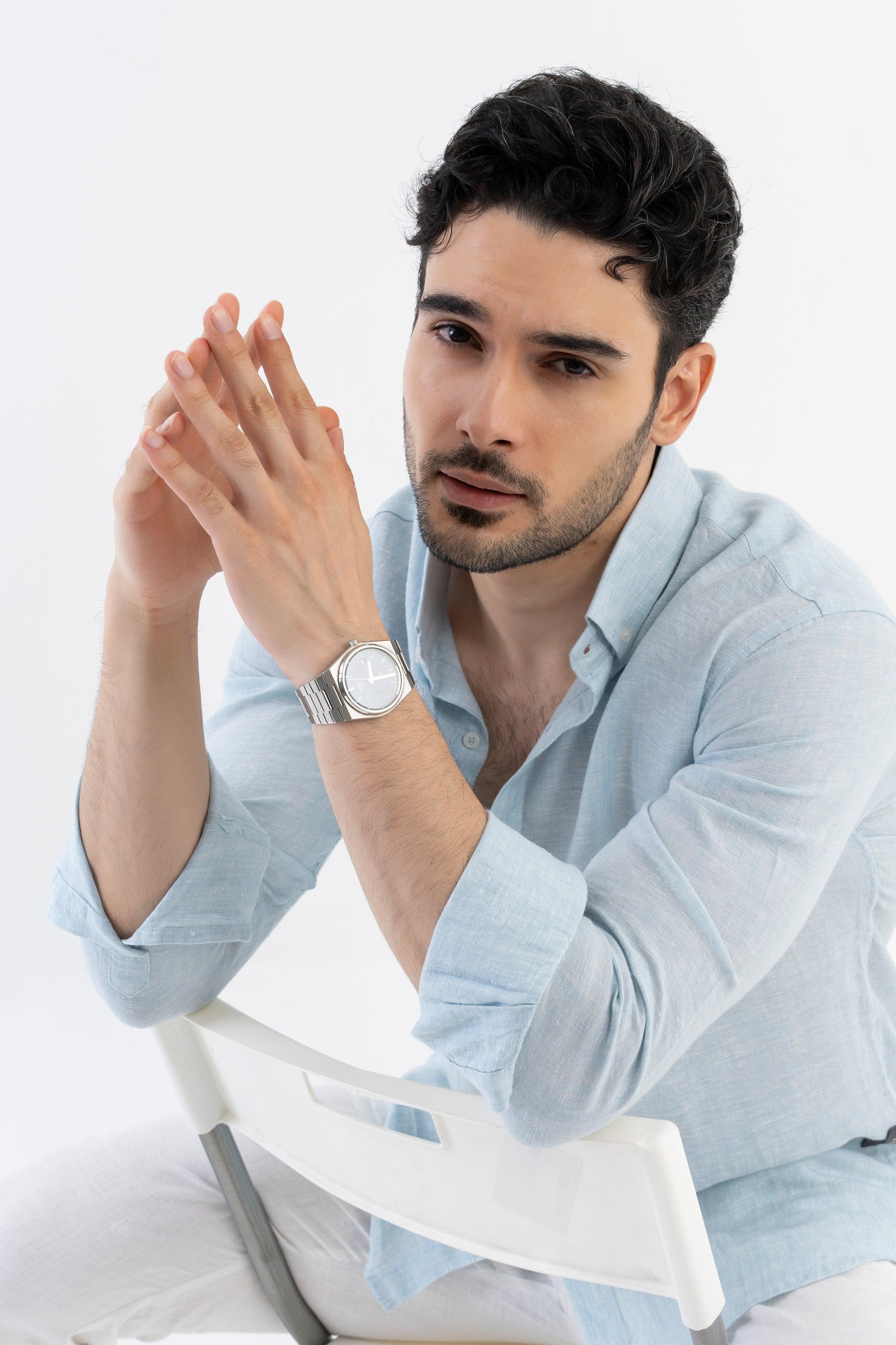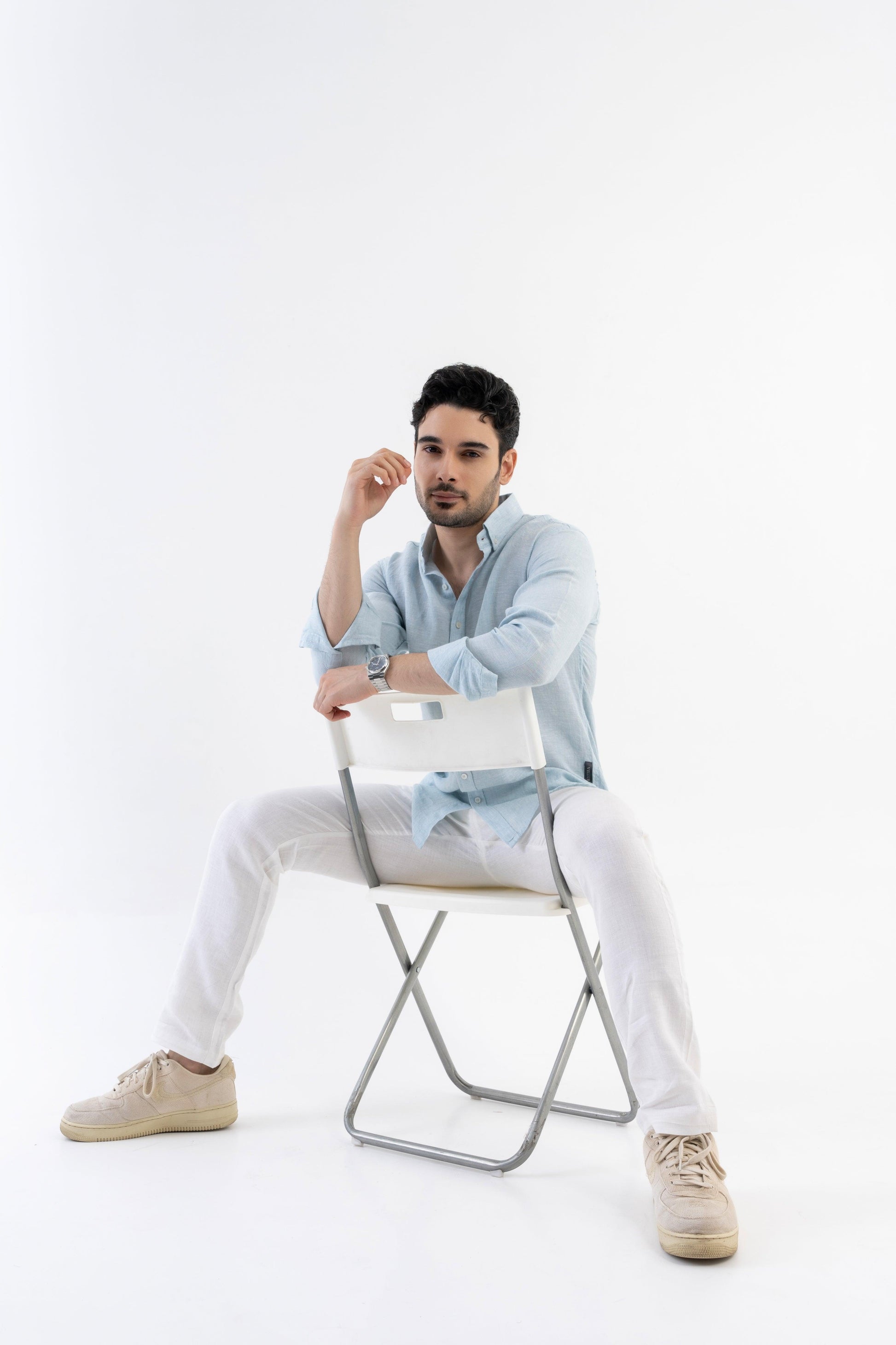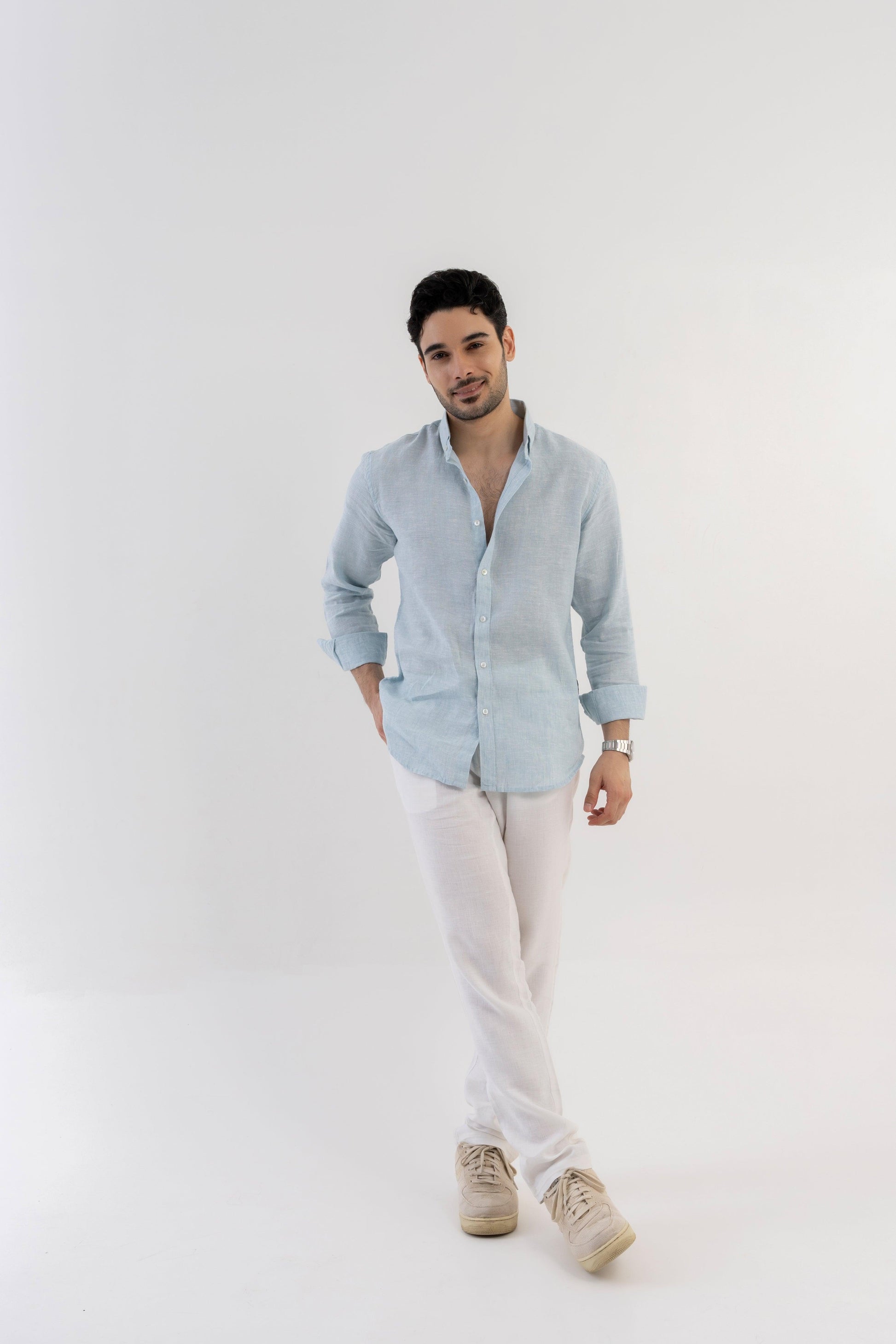 The long-sleeve soft frosty blue shirt is designed from a lightweight, breathable linen fabric, enzyme washed for extra softness — perfect for any semi-formal occasion.