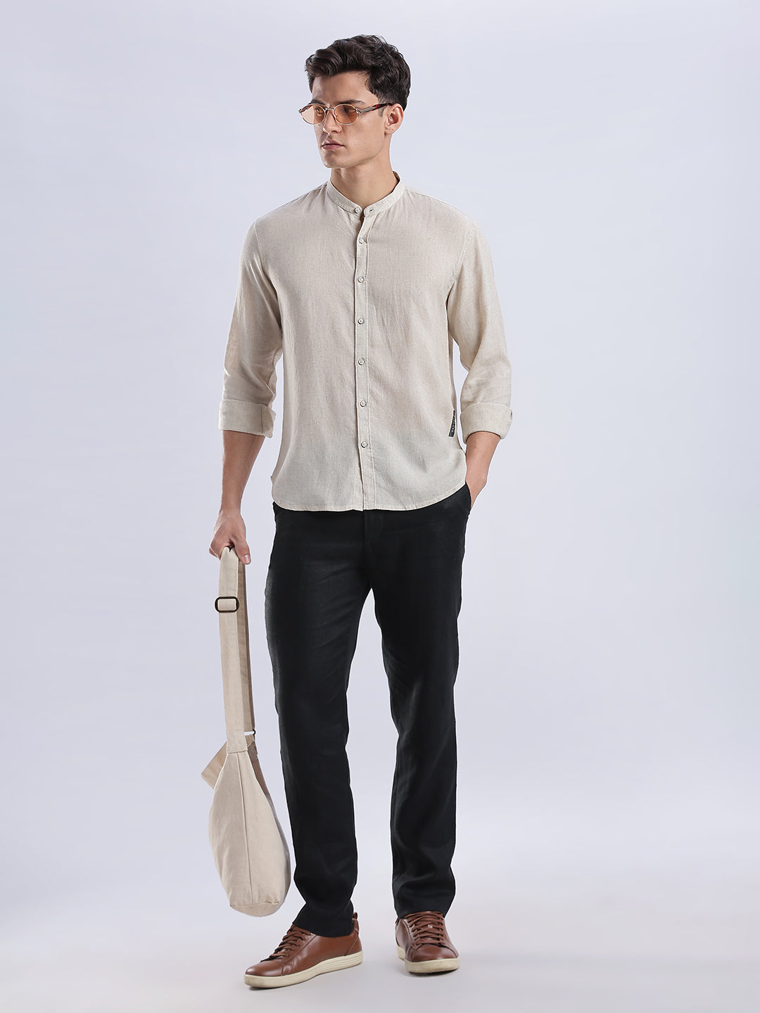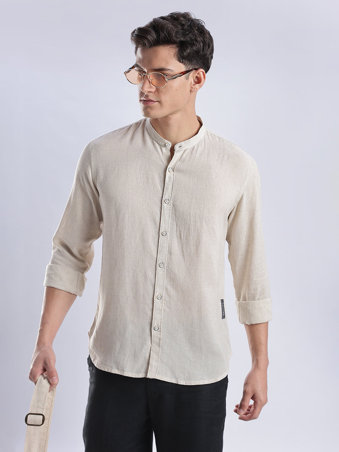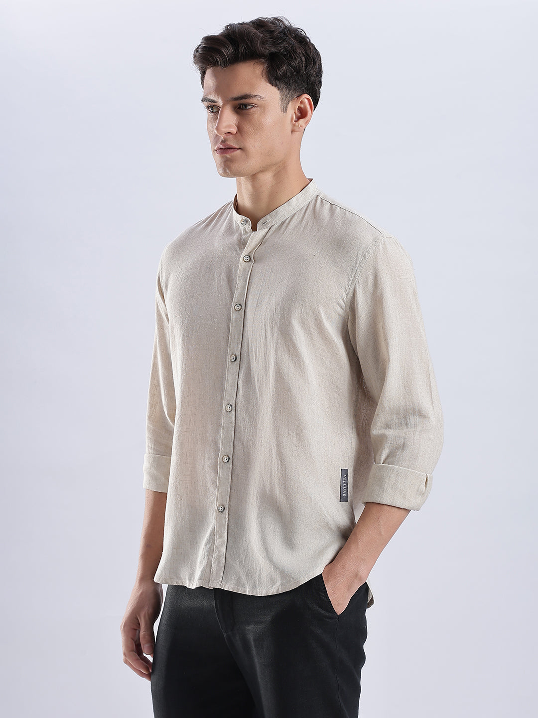 With its clean mandarin collar, natural wooden buttons, and relaxed fit, it brings quiet sophistication to everyday wear.