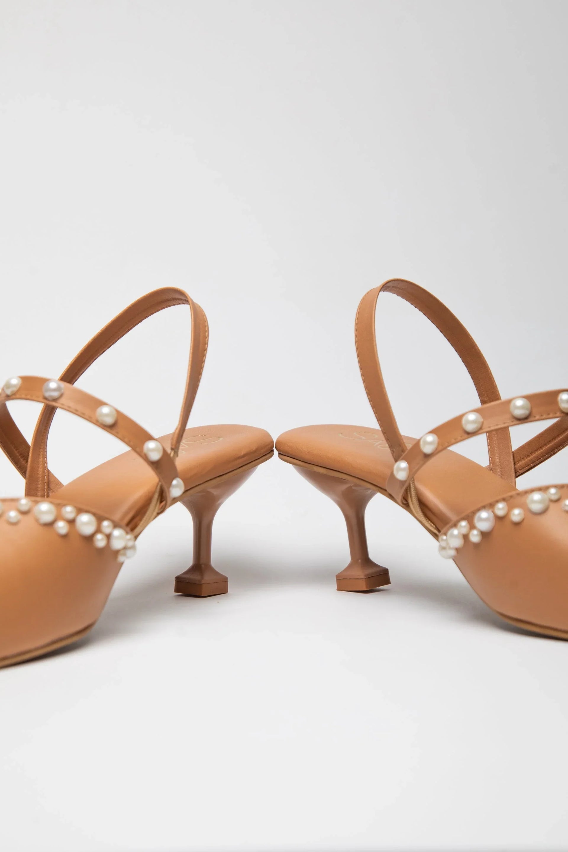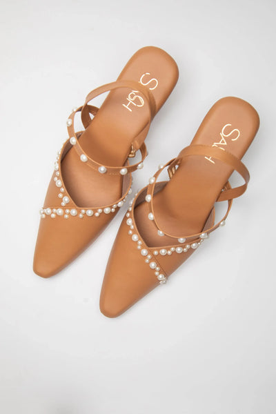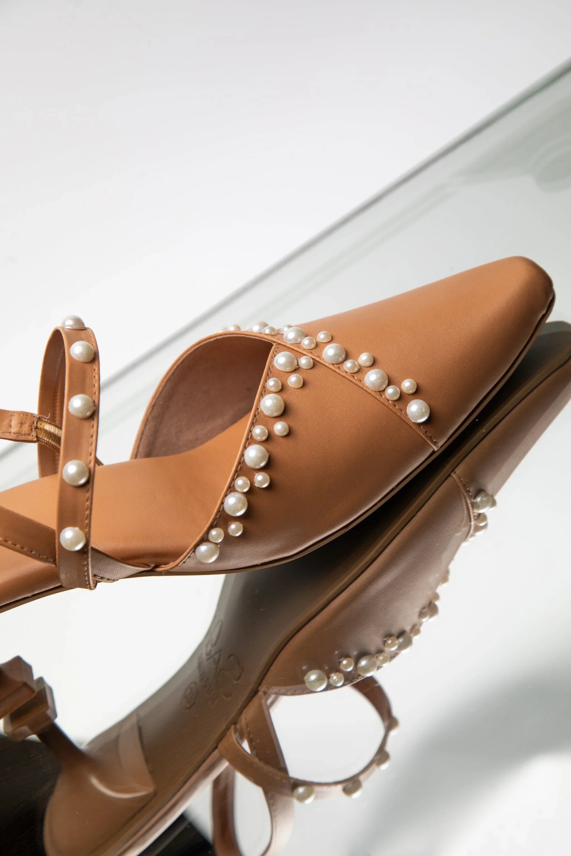 Step into refined elegance with our Honeyed Heels—cushioned closed-pointy sandals featuring 2-inch kitten heels. In a charming brown, these sandals are adorned with intricate pearl work and designed with ankle support for added comfort and style. Perfect for a touch of sophistication in every step.