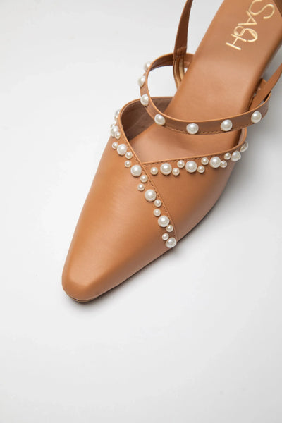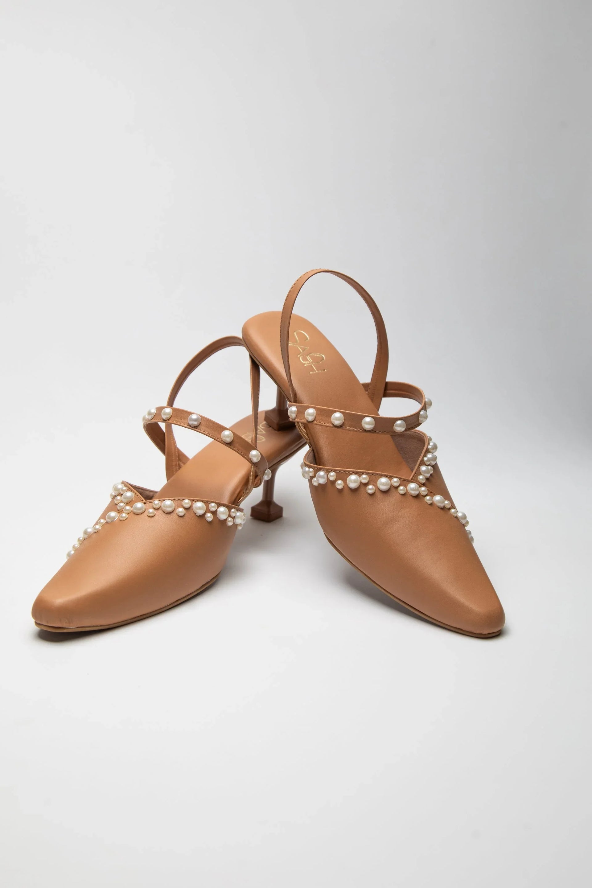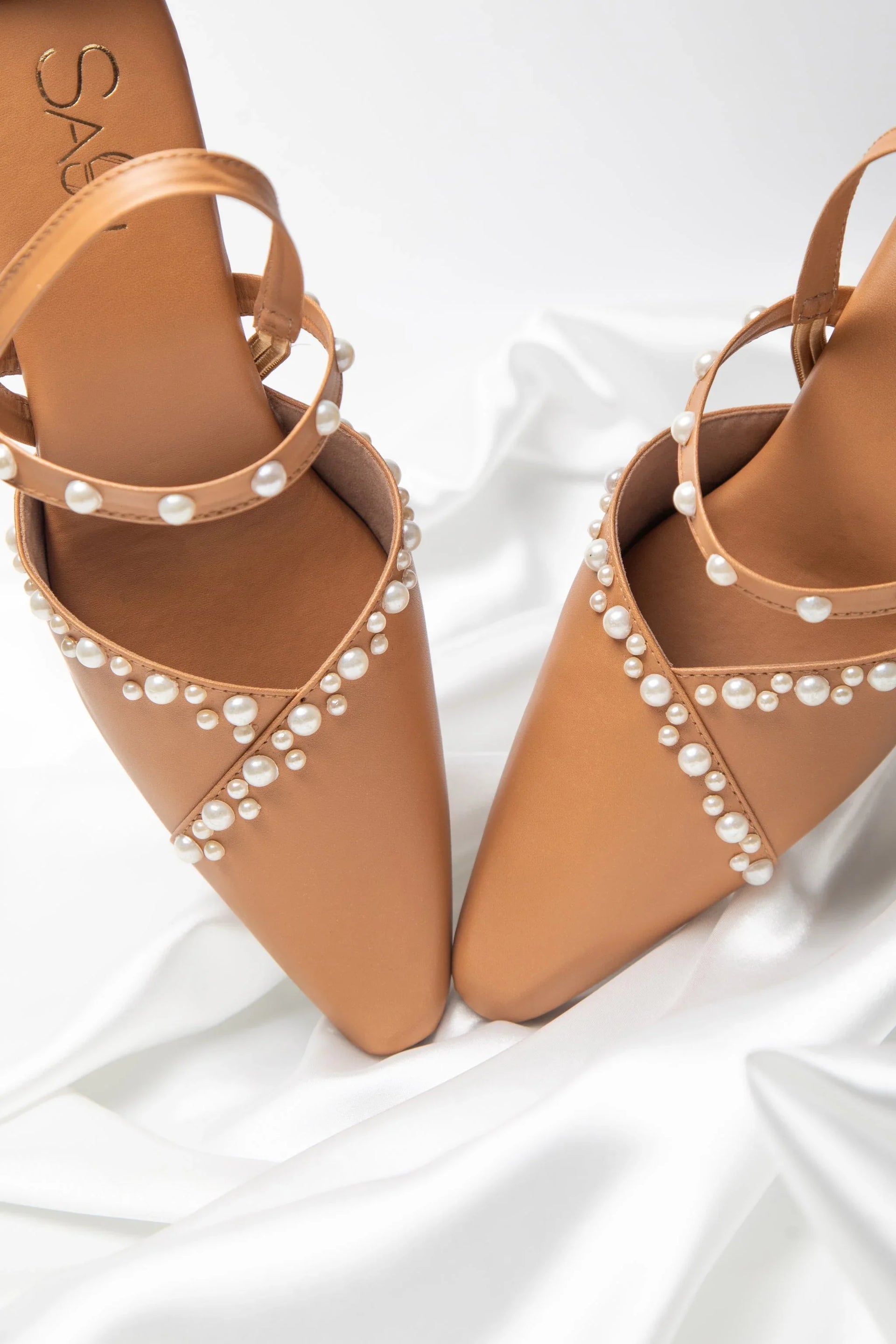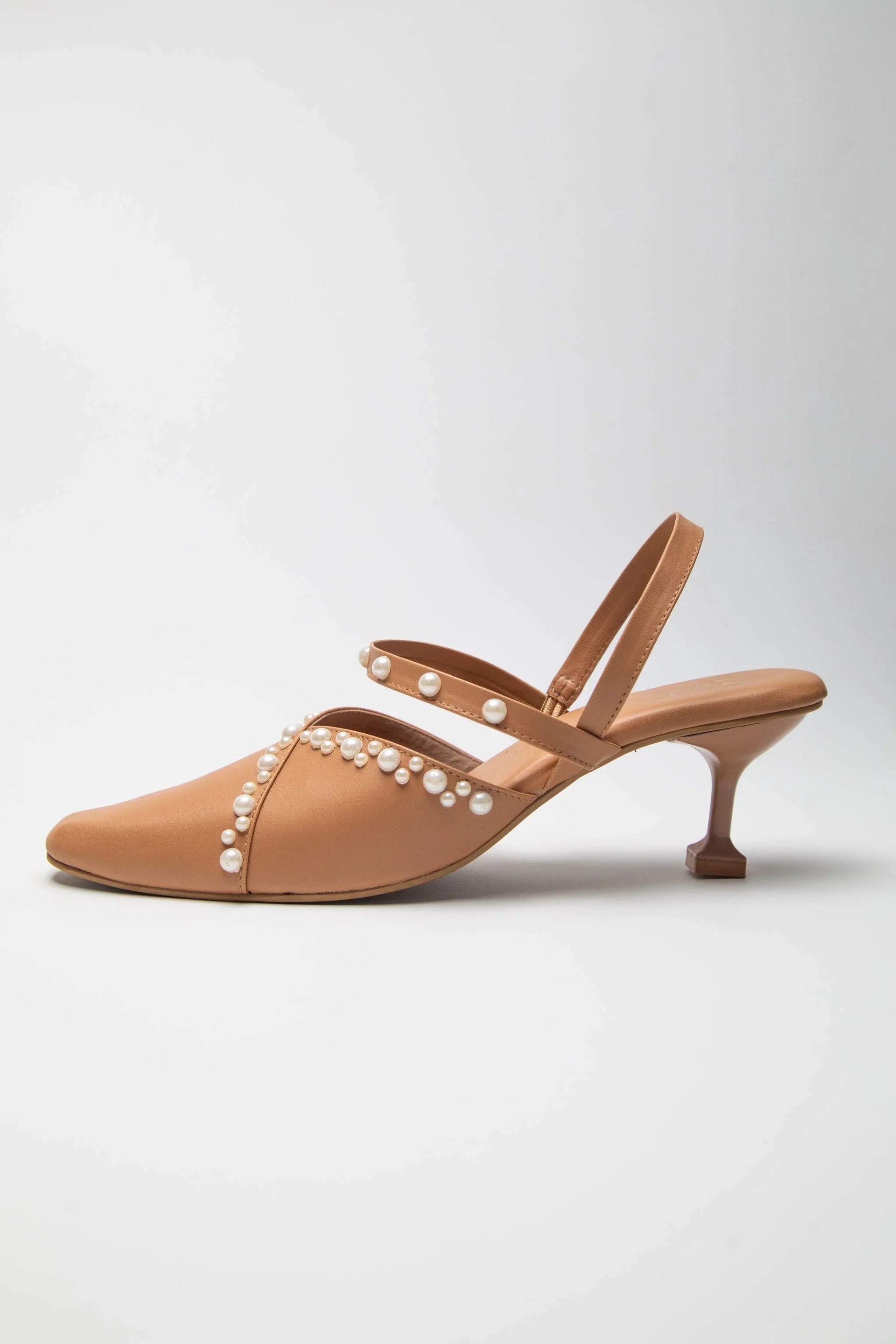 Step into refined elegance with our Honeyed Heels—cushioned closed-pointy sandals featuring 2-inch kitten heels. In a charming brown, these sandals are adorned with intricate pearl work and designed with ankle support for added comfort and style. Perfect for a touch of sophistication in every step.